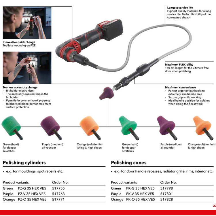 تلفیق شفت انعطاف پذیر مدل FS 140 و دستگاه پولیش شارژی فلکس مدل PXE 80 10.8-EC یک سیستم خلاقانه جهت پولیشکاری نقاط و زوایا و مناطق دور از دسترس ایجاد می کند که با سایر ابزارهای پولیشکاری سنتی قابل انجام نمی باشد. این شفت که ساخت کشور آلمان بوده جهت کاربری حرفه ای با حداکثر طول عمر طراحی و ساخته شده است. این شفت بدون نیاز به ابزار بر روی دستگاه پولیش PXE نصب شده و سره های مربوطه نیز بدون نیاز به ابزار بر روی شفت نصب می گردند. این شفت از ارگونومی فوق العاده ای جهت کارهای ظریف با بهترین نتایج برخوردار می باشد.