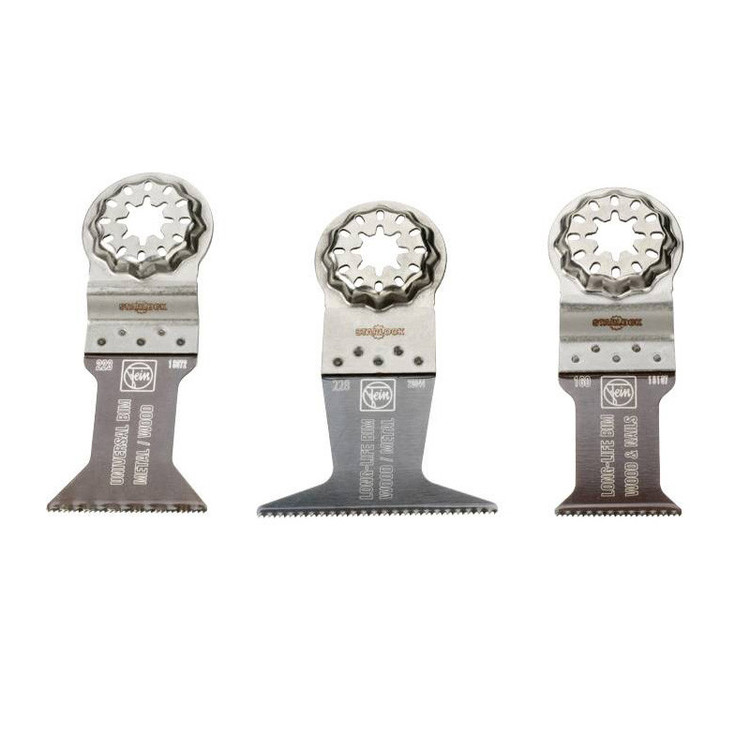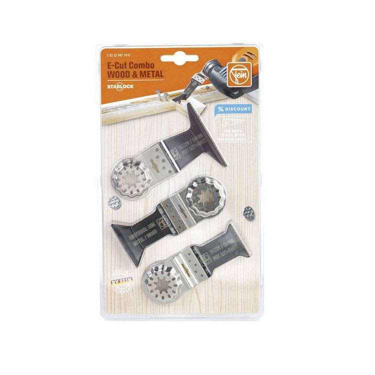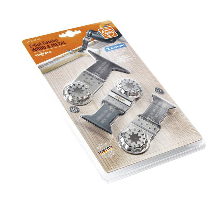 این مجموعه محصول شرکت فاین (FEIN) آلمان شامل یک عدد تیغه برش چوب و فلز مدل E-Cut long-life عرض 35 میلیمتر، یک عدد تیغه برش چوب و فلز مدل E-Cut long-life عرض 65 میلیمتر و یک عدد تیغه برش چوب و فلز مدل E-Cut universal عرض 44 میلیمتر می باشد.شرکت فاین (FEIN) در سال 1867 میلادی در شهر اشتوتگارت آلمان آغاز به کار، در سال 1895 اقدام به اختراع اولین دریل برقی دستی دنیا و در سال 1967 میلادی اولین ابزار ارتعاشی (چند کاره) دنیا را اختراع نمود. با توجه به تجربه 50 ساله فاین (FEIN) در تولید ابزار های ارتعاشی و تجهیزات جانبی آن، فاین ارائه دهنده جامع ترین ابزارآلات ارتعاشی برای کارهای داخلی ساختمان نظیر کار بر روی چوب، کابینت، انواع کف پوش، دیوارپوش، در و پنجره های چوبی، کاشی و سرامیک، کامپوزیت، ماکت سازی، کاربردهای هنری و دستی، صنعت خودرو و کشتی سازی و همچنین ارتپدی و آتشنشانی محسوب می گردد.