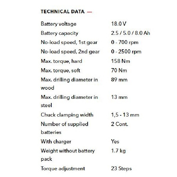 دستگاه DD 2G 18.0-EC HD/5.0 Set یک پیچ گوشتی دریل تمام صنعتی و حرفه ای از محصولات شرکت «فلکس» (Flex) با بیش از 100 سال سابقه و مخترع سنگ فرز می باشد. حداکثر گشتاور این ابزار 158 نیوتن متر بوده که بسیار قدرتمند محسوب می گردد. این ابزار دارای سیستم Anti kick back بوده و در صورت گیر کردن مته با خاموش کردن دستگاه از پیچش مچ کاربر جلوگیری میکند. همچنین این ابزار از سیستم توربو (افزایش سرعت تا 27%) و سیستم ترمز الکترونیکی برخوردار می باشد. این دریل پیچ گوشتی از موتور بدون ذغال برخوردار بوده که عمر و قدرت موتور را افزایش داده و مصرف انرژی آنرا کاهش می دهد. وزن آن با باتری تنها 2.2 کیلوگرم می باشد.این ابزار از تکنولوژی باتری لیتیوم یون استفاده کرده که منجر به افزایش طول عمر باتری و عملکرد آن خواهد شد. باتری های این ابزار 18V-5Ah می باشند که امکان استفاده بلند مدت از ابزار را میسر می سازند. سه نظام این ابزار تمام فلزی و اتوماتیک بوده و این ابزار داخل کیف های L-BOXX 136 فلکس ارائه شده می گردد. شرکت فلکس در سال 1922 در منطقه Bad Cannstatt نزدیک اشتوتگارت آلمان توسط Ackermann و Schmitt تاسیس گردید. در همان سال سنگ فرز MS6 با شفت Flexible و در سال 1954 اولین سنگ فرز سرعت بالای دنیا تحت عنوان DL9 توسط شرکت فلکس اختراع شد. هم اکنون شرکت فلکس معروفترین و معتبرترین تولید کننده پولیشر برقی و شارژی محسوب گردیده و تخصص آن تولید انواع ابزارآلات برقی و شارژی در صنایع خودرو، کار با فلزات، پرداخت سنگ و ابزارآلات مرتبط با ساخت و ساز و بازسازی می باشد.