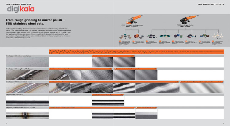 شرکت فاین (FEIN) در سال 1867 میلادی در شهر اشتوتگارت آلمان آغاز به کار و در سال 1895 میلادی اقدام به اختراع اولین دریل برقی دستی دنیا نمود. این شرکت در زمینه تولید ابزارآلات و تجهیزات جانبی تخصصی سنباده زنی و پولیش کاری سطوح فلزی بالاخص فولاد ضد زنگ (Stainless Steel) پیشرو بوده و همواره در نوآوری و اختراعات جدید صنعت ابزار دنیا نقش داشته است. علی رغم گذشت 151 سال از شروع تولیدات شرکت فاین، این شرکت قویا به خاستگاه خود یعنی کشور آلمان متعهد بوده و تمامی محصولاتش را در Schwäbisch Gmünd کشور آلمان تولید می نماید. ست سنباده زنی و پرداخت لوله فاین که تماما ساخت کشور آلمان بوده یک مجموعه حرفه ای است که به منظور سنباده زنی و پرداخت لوله های مستقیم استیل (ضد زنگ) مورد استفاده قرار می گیرد. برای استفاده از این مجموعه شما به دستگاه سنباده زنی و پولیش فاین مدل WPO 14-25 E نیاز خواهید داشت که باید به صورت جداگانه از دیجی کالا (گروه دستگاه سنباده زن) تهیه شود. نحوه استفاده از این مجموعه به این صورت است که به کمک غلطک موجود در این مجموعه می توانید نوارهای سنباده را دور لوله به چرخش درآورده و سطح آن ها را پرداخت کنید. (صافی سطح نهایی شما بستگی به دانه بندی نوار سنباده مورد استفاده خواهد داشت.) این مجموعه متشکل از یک غلطک مخصوص، 10 عدد نوار سنباده با دانه بندی 180، 10 عدد نوار سنباده با دانه بندی 120، یک عدد تسمه پشمی با دانه بندی متوسط، یک عدد تسمه پشمی با دانه بندی نرم و یک حلقه نوار چسب می باشد. در صورت تمایل به انجام عملیات وسیعتر نظیر از بین بردن خط جوش، از بین بردن خط و خش عمیق، خش دار کردن سطوح استیل (ضد زنگ) و یا ایجاد استیل (ضد زنگ) آینه ای می توانید ست های زیر را به صورت جداگانه از دیجی کالا خریداری کرده و به همراه دستگاه WPO 14-25 E استفاده کنید: - "ست سنباده زنی سطوح استیل (ضد زنگ)" : به منظور از بین بردن خط جوش، از بین بردن خط و خش عمیق و سطحی و در نهایت پرداخت استیل (ضد زنگ) مورد استفاده قرار می گیرد. این ست بایستی جداگانه از دیجی کالا خرید گردد. - "ست خش دار کردن سطوح استیل (ضد زنگ)" : به منظور خش دار کردن حرفه ای سطوح استیل (ضد زنگ) با بکارگیری سیلندر های متنوع الاستیک مورد استفاده قرار می گیرد. این ست بایستی جداگانه از دیجی کالا خرید گردد. - "ست پولیش و آینه ای کردن استیل (ضد زنگ)" : به منظور آینه ای کردن حرفه ای سطوح و پروفیل استیل (ضد زنگ) مورد استفاده قرار می گیرد. این ست بایستی جداگانه از دیجی کالا خرید گردد. - "ست خش دار کردن پروفیل و قوطی استیل (ضد زنگ)" : به منظور خش دار کردن حرفه ای پروفیل و قوطی استیل (ضد زنگ) با بکارگیری سیلندر های الاستیک مورد استفاده قرار می گیرد. این ست بایستی جداگانه از دیجی کالا خرید گردد. مزیت دستگاه سنباده زنی و پرداخت فاین مدل WPO 14-25 E کاربری وسیع آن (با توجه به سرعت متغیر و امکان بکارگیری تجهیزات جانبی متنوع) می باشد و شما برای انجام تمامی عملیات فوق دیگر نیازی به خرید ابزار جدید نخواهید داشت و تنها با استفاده از ست های مختلف تجهیزات جانبی مربوط به سنباده زنی و پولیش فولاد ضد زنگ (Stainless Steel) شرکت فاین به سطح مورد نظر خود خواهید رسید. شرکت TCG (گروه مشاوران تهران)، نماینده انحصاری ابزارآلات فاین (FEIN) آلمان در ایران بوده که این نماینده در سایت www.fein.com نیز معرفی شده است. خدمات گارانتی و پس از فروش محصولات فاین (FEIN) در مرکز تعمیرات TCG ارائه می گردد.