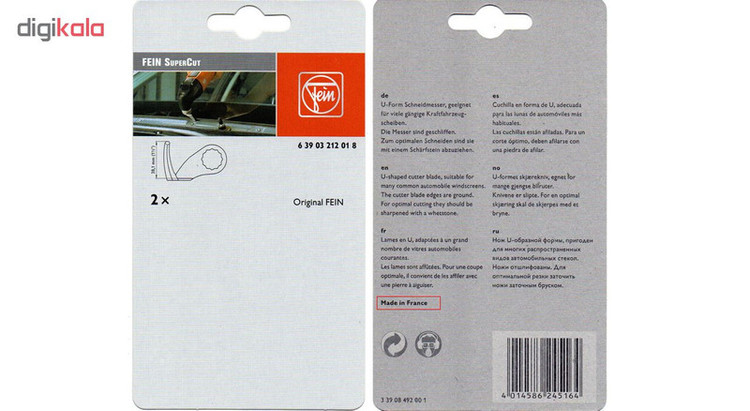 تيغه U شکل فرم 212 شرکت FEIN یکی از تیغه های پرکاربرد برای تعویض شیشه خودرو می باشد که طول قسمت برنده آن 38 میلیمتر بوده و در بسته بندی 2 تایی عرضه می شود و می توان از آن برای برش ماستیک موجود در پشت شیشه خودرو (قسمت بالای کاپوت ماشین) استفاده کرد. این تیغه تنها قابل استفاده در بر روی ابزار آلات همه کاره خودرو فاین مدل های FSC1.6Q - FSC1.7Q - AFSC1.7Q می باشد. شركت فاين (FEIN) در سال 1867 ميلادي در شهر اشتوتگارت آلمان آغاز به كار، در سال 1895 اقدام به اختراع اولين دريل برقي دستي دنيا و در سال 1967 ميلادي اولين ابزار ارتعاشي (چند كاره) دنيا را اختراع نمود. با توجه به تجربه 50 ساله فاين (FEIN) در توليد ابزار هاي ارتعاشي و تجهيزات جانبي آن، فاين ارائه دهنده جامع ترين ابزارآلات ارتعاشي براي صنعت خودرو، كارهاي داخلي ساختمان، كاربردهاي ارتوپدي و ... محسوب مي گردد.