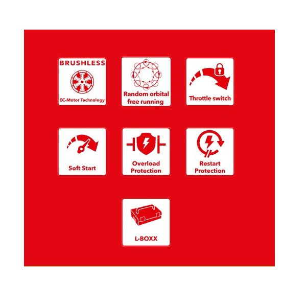 2 عدد باتری 18 ولت 5 آمپر ساعت-شارژر-1 عدد پد پشت چسبان به قطر 150 میلیمتر - 1 عدد پد پشت چسبان به قطر 125 میلیمتر-کیف حمل شکیل L-BOXX 238
