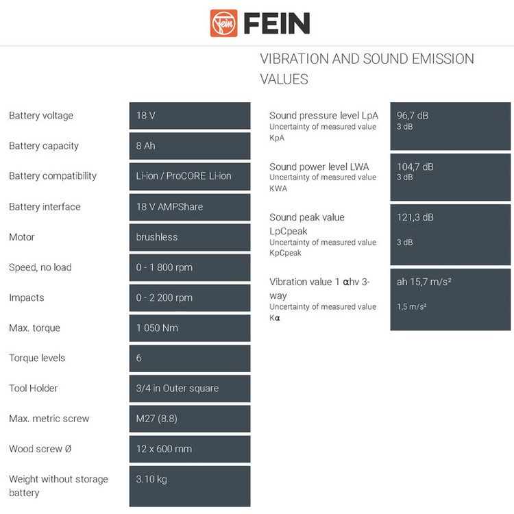 شرکت فاین (FEIN) در سال 1867 میلادی در شهر اشتوتگارت آلمان آغاز به کار و در سال 1895 اقدام به اختراع اولین دریل برقی دستی دنیا نمود. آچار بکس ضربه ای شارژی مدل ASCD 18-1000 W34 AS یک آچار حرفه ای و صنعتی با مشخصات فنی خاص محسوب می گردد. طراحی و ساخت این آچار بکس جهت کار در شرایط سخت و مداوم می باشد. حداکثر گشتاور این آچار با بهره گیری از موتور بدون ذغال در حالت بستن 1050 و در حالت باز کردن 1500 نیوتن متر می باشد. این آچار ضربه ای قابلیت تنظیم الکترونیکی گشتاور در 6 مرحله از 300 نیوتن متر تا 1050 نیوتن متر را دارد که این قابلیت آن را از بقیه رقبا متمایز می سازد. با تنظیم گشتاور مورد نظر، پیچ یا مهره شما هیچ گاه بریده نشده و گشتاور مناسب به پیچ یا مهره شما اعمال خواهد شد؛ لذا این آچار ضربه ای در طیف وسیعی از کاربری ها از 300 نیوتن متر الی 1050 نیوتن متر قابل استفاده خواهد بود و شما را از خرید آچارهای متعدد بی نیاز می سازد. سرعت بدون بار این ابزار 1800-0 دور در دقیقه و نرخ ضربه آن 2200-0 ضربه در دقیقه می باشد. ابزار گیر این آچار بکس 3/4 اینچ است. وزن این آچار با احتساب باتری تنها 3.9 کیلوگرم بوده و انرژی مورد نیاز خود را از باتری (ProCORE) هجده ولت با ظرفیت 8 آمپر ساعت تامین می کند. داخل کیف بسیار محکم این ابزار 2 عدد باتری ProCORE 18ولت با ظرفیت 8 آمپرساعت و یک عدد شارژر سریع وجود دارد. این ابزار از موتور بدون ذغال بهره گرفته که کارایی آن را 30% افزایش می دهد. حداکثر سایز مهره قابل بستن با این ابزار M27 می باشد. با یک شارژ باتری امکان بستن 600 مهره سایز M27 وجود دارد.