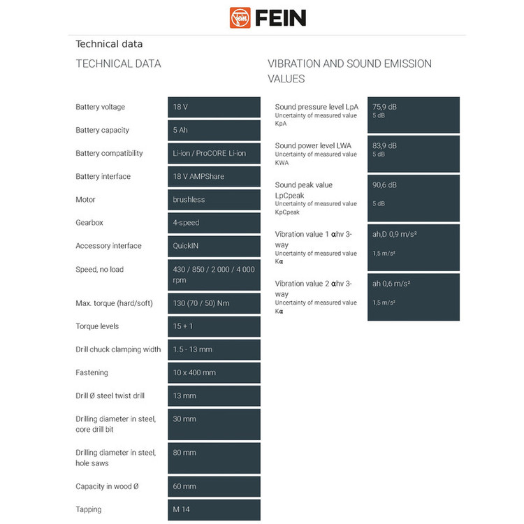 شرکت فاین (FEIN) در سال 1867 میلادی در شهر اشتوتگارت آلمان آغاز به کار و در سال 1895 اقدام به اختراع اولین دریل برقی دستی دنیا نمود. علی رغم گذشت 151 سال از شروع تولیدات شرکت فاین، این شرکت قویا به خاستگاه خود یعنی کشور آلمان متعهد بوده و تمامی محصولاتش را در Schwäbisch Gmünd کشور آلمان تولید می نماید. دریل / پیچ گوشتی شارژی مدل ASCM 18-4 QM AS یک دریل / پیچ گوشتی حرفه ای با مشخصات فنی خاص محسوب می گردد. این ابزار از گیربکس تمام فلزی چهار حالته با سرعتهای 430/ 850/ 2000/ 4000دور در دقیقه برخوردار بوده که امکان دریل کاری حرفه ای با سرعت بهینه در مواد و قطر های مختلف را مهیا می سازد. این دریل / پیچ گوشتی با بهره گیری از موتور بدون ذغال گشتاور حداکثر 130نیوتن متر را تامین می نماید که قوی ترین دریل / پیچ گوشتی شارژی در کلاس 18 ولت محسوب می گردد. گشتاور این ابزار به صورت الکترونیکی در 1+15 مرحله قابل تنظیم است. وزن این دریل / پیچ گوشتی قدرتمند به همراه باتری تنها 1.9 کیلوگرم می باشد. سه نظام فلزی این ابزار قابل جدا شدن بوده و در صورت خرید سری های اضافه از دیجی کالا نظیر سری نگهدارنده پیچ گوشتی، سری قلاویز کاری ، سری 90 درجه و سری بکس 1/2; قابل نصب بر روی این دستگاه می باشند. داخل کیف بسیار محکم این ابزار 2 عدد باتریGBA 18V 5.0 Ah AS و یک عدد شارژر سریع GAL 1880 CV ASوجود دارد. این ابزار از موتور بدون ذغال بهره گرفته که کارایی آن را 30% افزایش می دهد. با یک شارژ باتری امکان بستن 1700 پیچ وجود دارد.