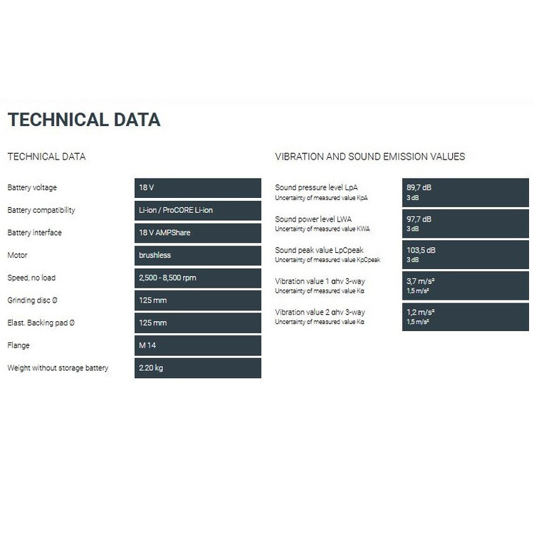 باتری ۱۸V-۸Ah دو عدد (Li-ion / ProCORE ) و شارژر GAL ۱۸v-۱۶۰ باتری- ۱ عدد گارد- ۱ عدد دسته ضد ارتعاش ۱ عدد آچار مخصوص- ۱عدد مهره quick-in بدون نیاز به آچار - ۱ عدد گارد ایمنی مخصوص برش-کیف شکیل L-BOXX ۲۳۸