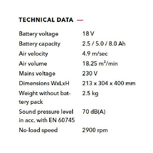 فن شارژی CF 18.0/230 یک فن شارژی حرفه ای و با کیفیت از محصولات شرکت «فلکس» (Flex) آلمان با بیش از 100 سال سابقه و مخترع سنگ فرز می باشد. این دستگاه یک فن دمنده شارژی قدرتمند و جمع و جور با حداکثر هوادهی 18.25 متر مکعب در دقیقه می باشد . دستگاه دارای سیستم مدیریت الکترونیکی (EMS) به منظور محافظت از دستگاه و افزایش عمر سرویس و کارایی می باشد. امکان استفاده انعطاف پذیر به لطف قلاب، اتصالات 1/4 و 5/8 اینچی و سر چرخشی 180 درجه فراهم شده است . دستگاه امکان استفاده از باتری های 18 ولت فلکس و یا برق مستقیم 230 ولت را دارا می باشد. شرکت فلکس در سال 1922 در منطقه Bad Cannstatt نزدیک اشتوتگارت آلمان توسط Ackermann و Schmitt تاسیس گردید. در همان سال سنگ فرز MS6 با شفت Flexible و در سال 1954 اولین سنگ فرز سرعت بالای دنیا تحت عنوان DL9 توسط شرکت فلکس اختراع شد.