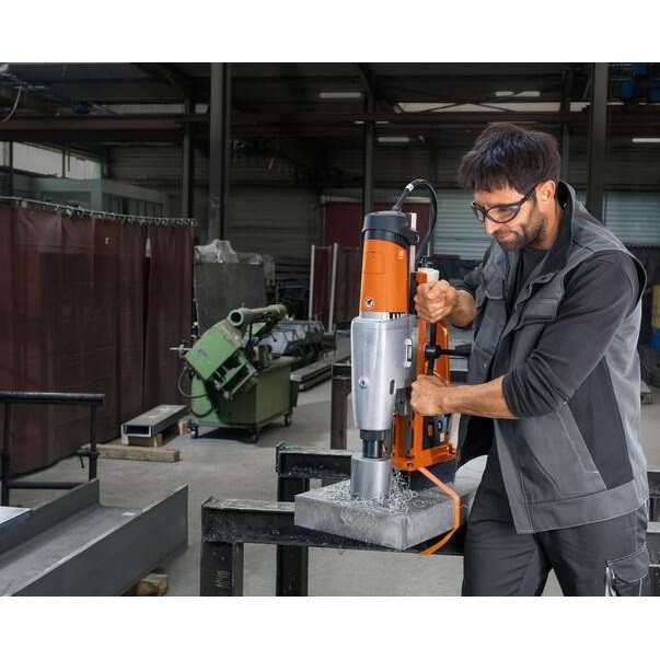 دریل مغناطیسی مدل KBU 110-4 M یک دریل مغناطیسی حرفه ای و صنعتی با مشخصات فنی خاص محسوب می گردد. طراحی و ساخت این دریل که تماما ساخت کشور آلمان بوده، جهت کار در شرایط سخت و مداوم است . امکان گردبری حرفه ای تا قطر 110میلیمتر (110میلیمتر با مته های الماسه و تا قطر 80میلیمتر با مته های HSS) در فلزات و دریل کاری سنتی تا قطر 40 میلیمتر را مهیا می سازد.دارای سیستم خنک کار - روان کار متصل با دستگاه می باشد به نحوی که مایع خنک کار - روان کار به واسطه نیروی وزن به صورت خودکار به محل انجام عملیات گردبٌری جاری خواهد شد و فقط در موارد استفاده به صورت افقی و یا بالای سر نیاز به استفاده از مایع روان کار - خنک کار به صورت دستی خواهید داشت. که امکان استفاده جهت کار مداوم، حرفه ای و با دقت بالا را فراهم ساخته و باعث می شود تا پس از گذشت زمان و استفاده مداوم از دستگاه، دقت آن کاهش نیافته و یا به لرزش نیافتد. ابزارگیر گرد بر Weldon 32 میباشد. این دریل قابلیت چرخش به صورت ساعت گرد و پاد ساعت گرد را دارد و بازه کل کورس این دریل مغناطیسی 400 میلیمتر بوده که به شما آزادی عمل زیادی در انتخاب ابزارهای دریل کاری خواهد داد. رابط کاربری دستگاه در راستای دید کاربر در حین انجام عملیات می باشد و همچنین این دستگاه به نمایشگر میزان چسبندگی مگنت مجهز است به نحوی که چراغ مگنت در شرایط عدم وجود نیروی کافی جهت نگه داشتن دستگاه به صورت چشمک زن در می آید. شرکت فاین (FEIN) در سال 1867 میلادی در شهر اشتوتگارت آلمان آغاز به کار و در سال 1895 اقدام به اختراع اولین دریل برقی دستی دنیا و در سال 1909 اولین دریل مغناطیسی دنیا را اختراع نمود. علی رغم گذشت 151 سال از شروع تولیدات شرکت فاین، این شرکت قویا به خاستگاه خود یعنی کشور آلمان متعهد بوده و تمامی محصولاتش را در Schwäbisch Gmünd کشور آلمان تولید می نماید.