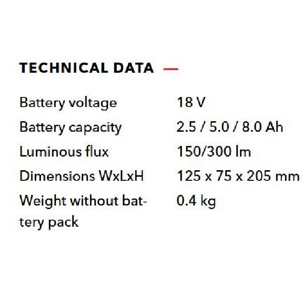 چراغ قوه WL 300 18.0 یک چراغ قوه شارژی پر قدرت و حرفه ای از محصولات شرکت «فلکس» (Flex) آلمان با بیش از 100 سال سابقه و مخترع سنگ فرز می باشد. این چراغ قوه قابل استفاده با باتری های 18 ولت شرکت فلکس میباشد.شدت نور این چراغ قوه در دو درجه با نوردهی 150 و 300 لومن قابل تنظیم است. این چراغ قوه دارای طرحی سبک و ارگونومیک با دسته نرم برای راحتی کاربری می باشد. باتری و شارژر همراه دستگاه ارائه نمی گردد ودر صورتی که از قبل باتری 18 ولت فلکس را در اختیار ندارید لازم است به صورت جداگانه تهیه شود. شرکت فلکس در سال 1922 در منطقه Bad Cannstatt نزدیک اشتوتگارت آلمان توسط Ackermann و Schmitt تاسیس گردید. در همان سال سنگ فرز MS6 با شفت Flexible و در سال 1954 اولین سنگ فرز سرعت بالای دنیا تحت عنوان DL9 توسط شرکت فلکس اختراع شد. هم اکنون شرکت فلکس معروفترین و معتبرترین تولید کننده پولیشر برقی و شارژی محسوب گردیده و تخصص آن تولید انواع ابزارآلات برقی و شارژی در صنایع خودرو، کار با فلزات، پرداخت سنگ و ابزارآلات مرتبط با ساخت و ساز و بازسازی می باشد.