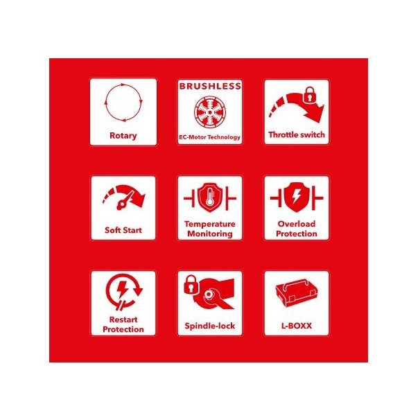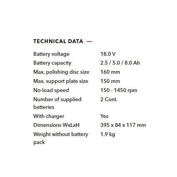 1 عدد پد پشت چسبان به قطر 150 میلیمتر-1 عدد دسته-2 عدد باتری 18 ولت 5 آمپر ساعت-شارژر-کیف حمل شکیل L-BOXX 238