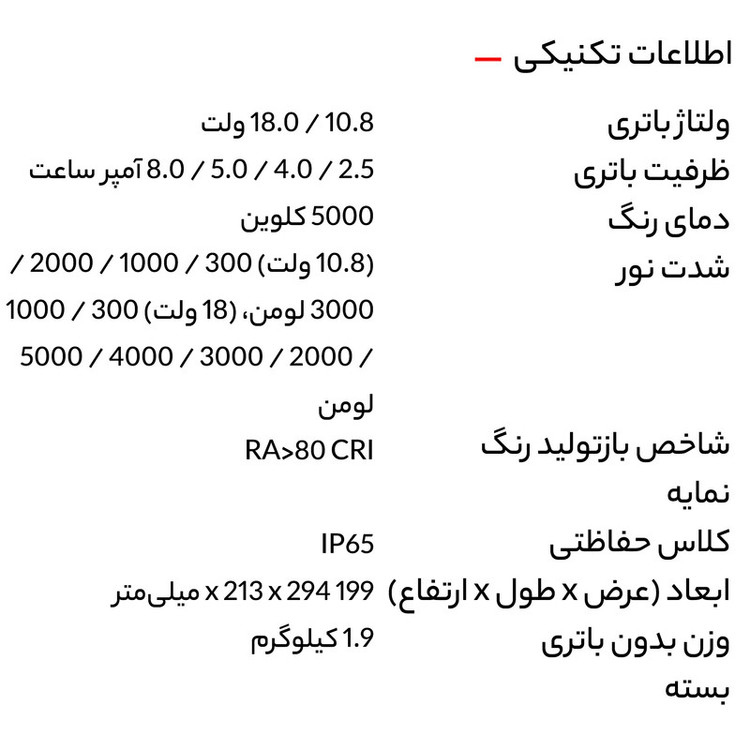 نورافکن CL 5000 18.0 یک نورافکن پر قدرت و حرفه ای از محصولات شرکت «فلکس» (Flex) آلمان با بیش از 100 سال سابقه و مخترع سنگ فرز می باشد. این نورافکن قابل استفاده با تمامی باتری های 10.8 ولت و 18 ولت شرکت فلکس میباشد.شدت نور این نور افکن با باتری 10/8 ولت 300-1000-2000 , 3000 لومن و با باتری 18 300-1000-2000-3000-4000 و 5000 لومن قابل تنظیم میباشد.این دستگاه به همراه باتری ارائه نمیگردداز این رو لازم هست از قبل باتری های شرکت فلکس را در اختیار داشته باشید. شرکت فلکس در سال 1922 در منطقه Bad Cannstatt نزدیک اشتوتگارت آلمان توسط Ackermann و Schmitt تاسیس گردید. در همان سال سنگ فرز MS6 با شفت Flexible و در سال 1954 اولین سنگ فرز سرعت بالای دنیا تحت عنوان DL9 توسط شرکت فلکس اختراع شد. هم اکنون شرکت فلکس معروفترین و معتبرترین تولید کننده پولیشر برقی و شارژی محسوب گردیده و تخصص آن تولید انواع ابزارآلات برقی و شارژی در صنایع خودرو، کار با فلزات، پرداخت سنگ و ابزارآلات مرتبط با ساخت و ساز و بازسازی می باشد.