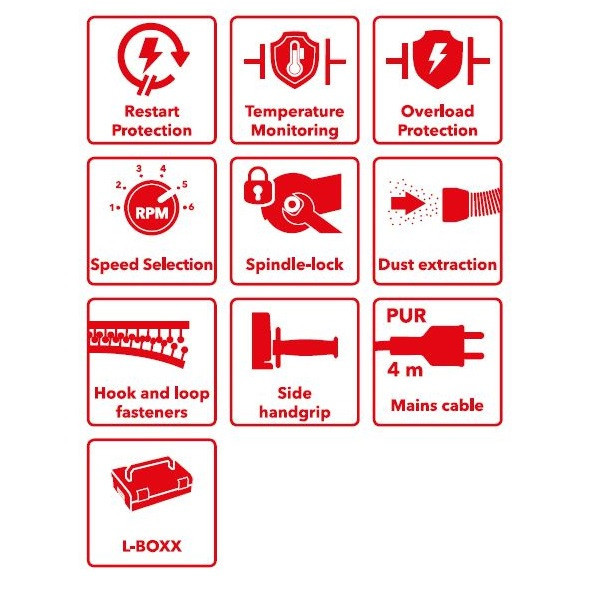 1 عدد محافظSG D150 SE - یک عدد دسته SE 14-2 125M8 - یک عدد پد پشت چسبان SP D150-8/6 H/F - چهار عدد صفحه سنباده 150 میلیمتر - یک عدد آچار سوکت 6 ضلعی SW4-یک عدد آچار سوکت 6 ضلعی SW5 بلند- سه عدد گیره کابل-1 عدد آچار مخصوص - کیف L-BOXX 238